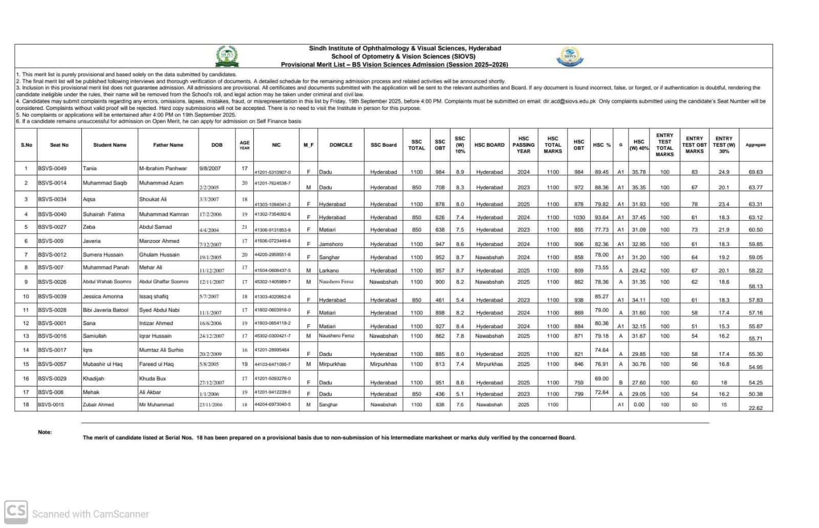 03 | List of Candidates Provisionally Selected for Admission in BS Vision Science (On Merit) | Click Here to Download |